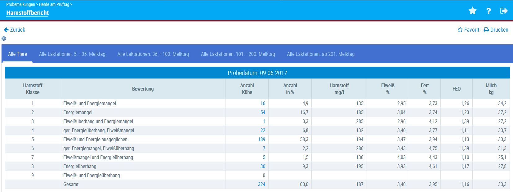 In der Tabelle werden die neun Harnstoffklassen plus die gesamte Herde mit Ihrer Bewertung aufgeführt.