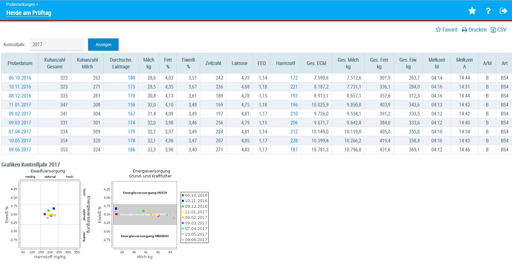 Die Grafiken zeigen das Niveau der Eiweiß- und Energieversorgung an den einzelnen Kontrolltagen und geben somit einen Überblick über die Versorgungssituation der gesamten Herde im Kontrolljahr.