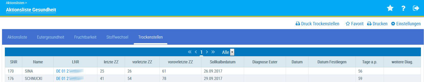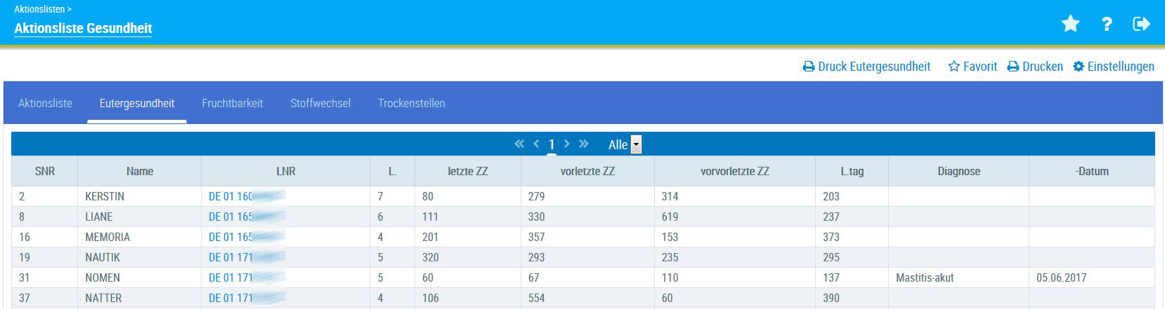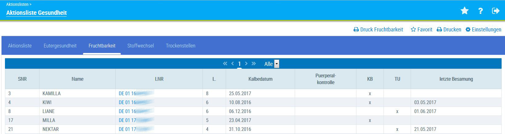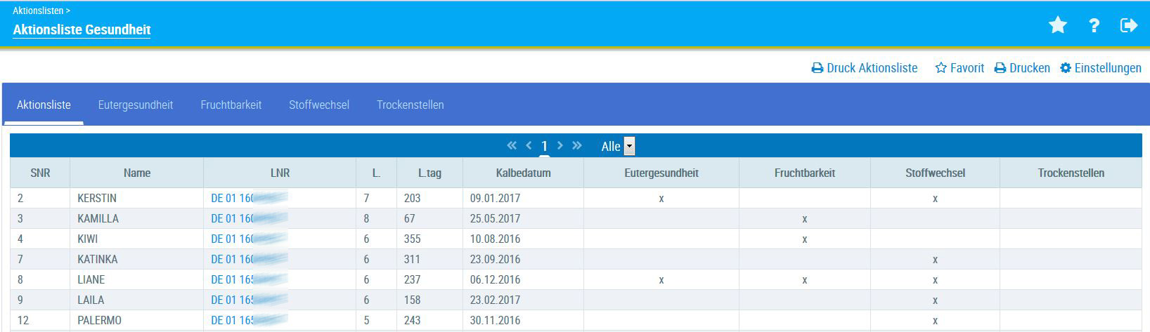 Die Aktionsliste Eutergesundheit zeigt alle Kühe, die im Bereich Eutergesundheit ein Problem haben: