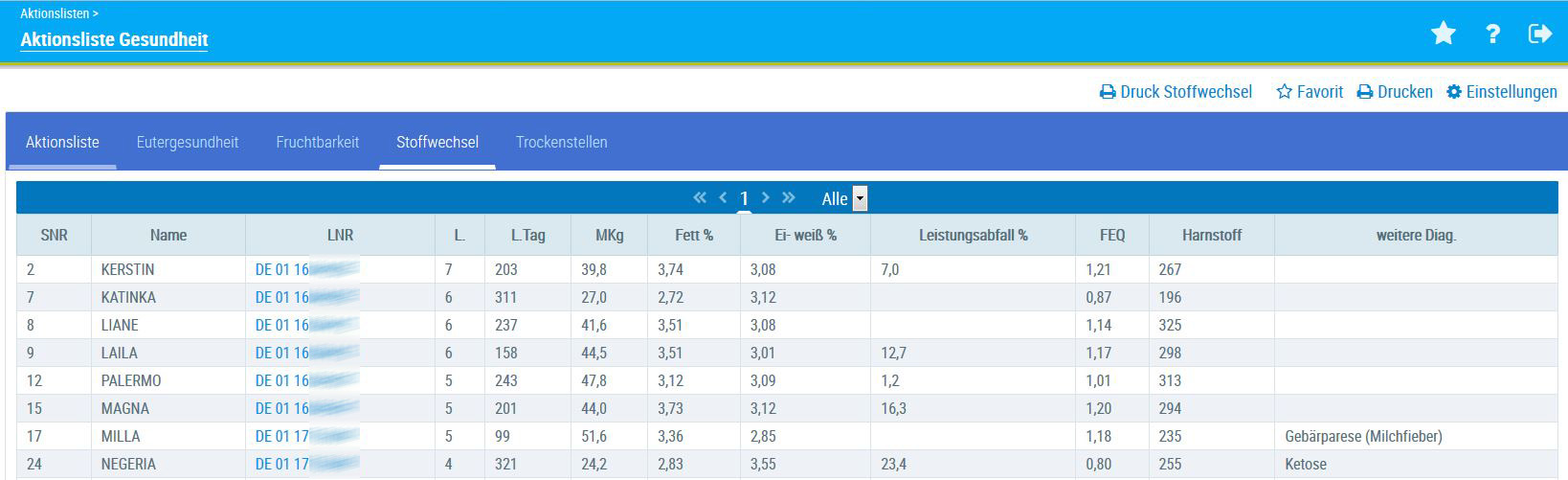 In der Aktionsliste Stoffwechsel werden jene Tiere gelistet, die beim letzten Probemelken (PM) die eingestellten Grenzwerte überschritten haben.