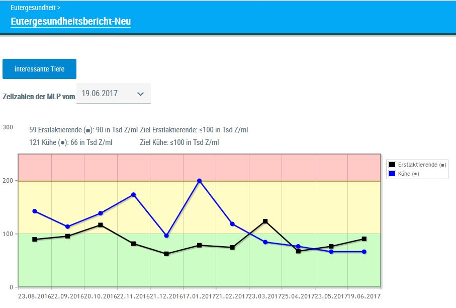 Die Grafik zeigt dabei den Verlauf der durchschnittlichen Herdenzellzahl (in 1.000 Zellen/ml Milch) des letzten Jahres, unterteilt in Färsen (schwarz) und Kühe (blau). Dadurch werden jegliche Veränderungen der Eutergesundheit der Herde im Zeitverlauf sichtbar.
