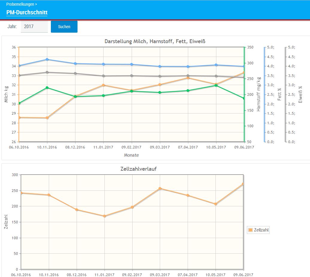 Hier finden Sie eine interaktive Grafik für das aktuelle Kontrolljahre mit den einzelnen Kontrollergebnissen für Milch kg, Harnstoff, Fett % und Eiweiß % sowie Zellzahl.