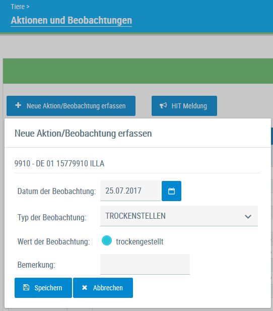 Auf der rechten Seite können Sie auswählen welche Aktionen und Beobachtungen für das Tier angezeigt werden sollen indem Sie die Häkchen setzen oder entfernen.