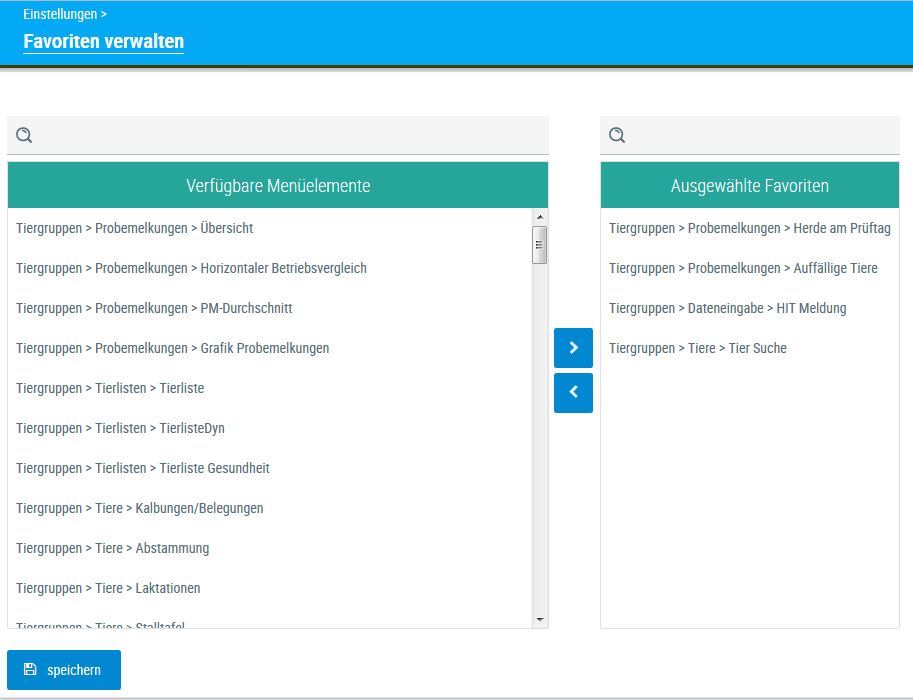 Sie können Seiten als Favoriten an- bzw. abwählen, indem Sie entweder die entsprechende Seite anklicken und über die Pfeile in der Mitte '›,‹' zu den ausgewählten Favoriten oder zu den verfügbaren Menüelementen oder indem Sie die entsprechende Seite mit der linken Maustaste gedrückt halten und zur anderen Seite schieben.